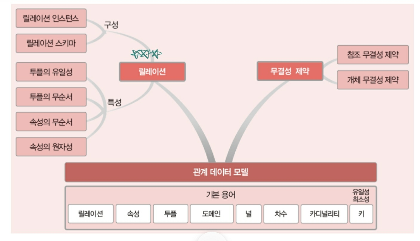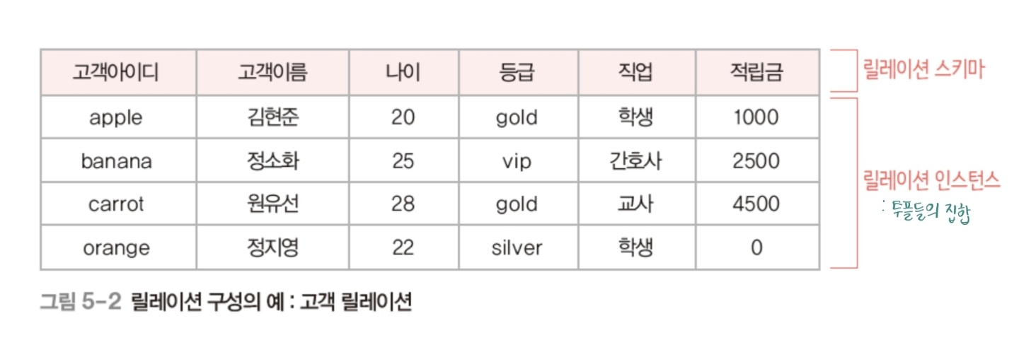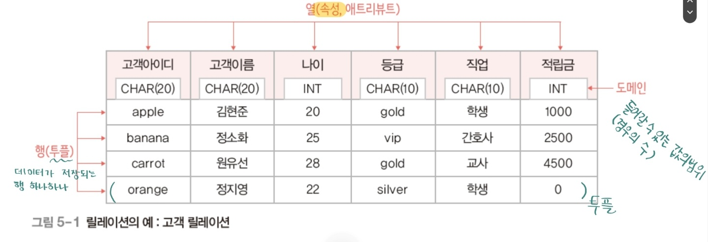 - 릴레이션: 하나의 개체에 관한 데이터를 2차원 테이블 구조로 저장. 파일 관리 시스템에서 파일에 대응