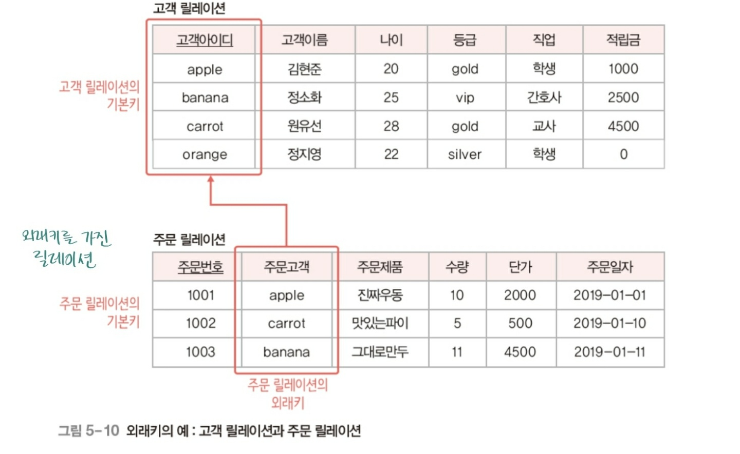 - 외래키: 다른 릴레이션들의 기본키를 참조하는 속성 또는 속성들의 집합. 다른 릴레이션들과의 관계 표현