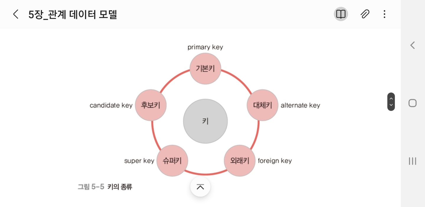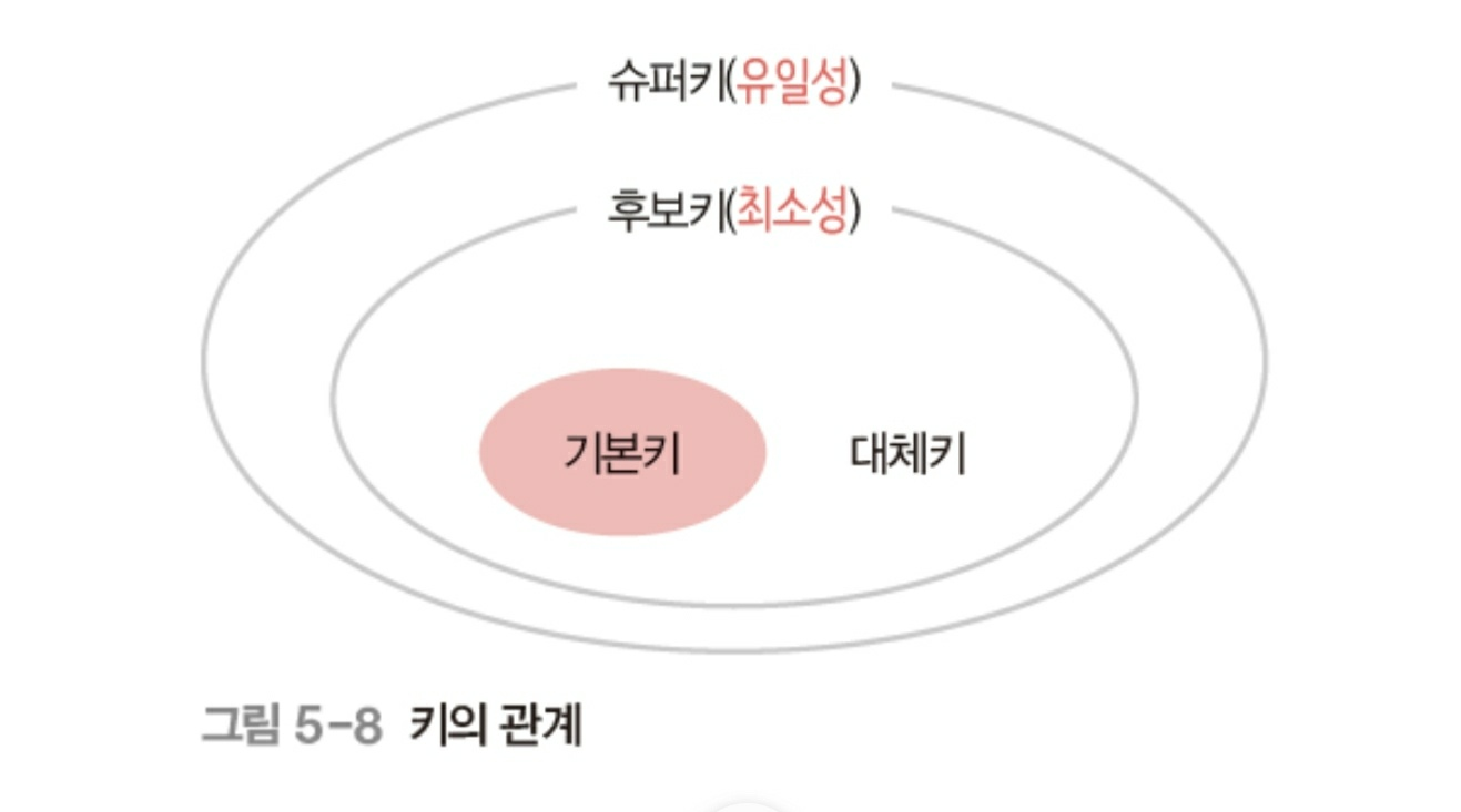 - 기본키: 후보키 중 기본적으로 사용하기 위해 선택한 키