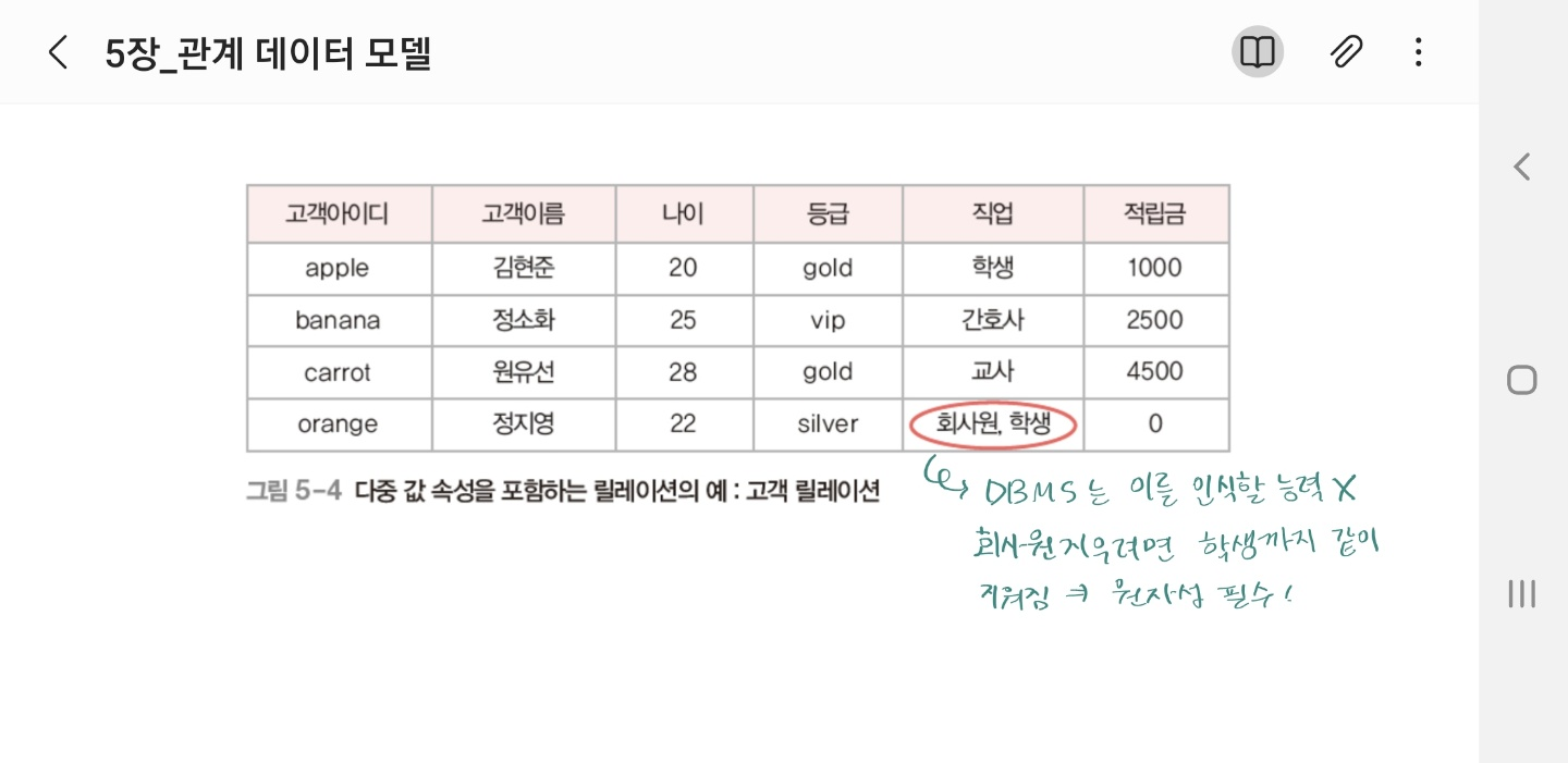 - 속성의 원자성: 속성값으로는 원자 값만 사용가능