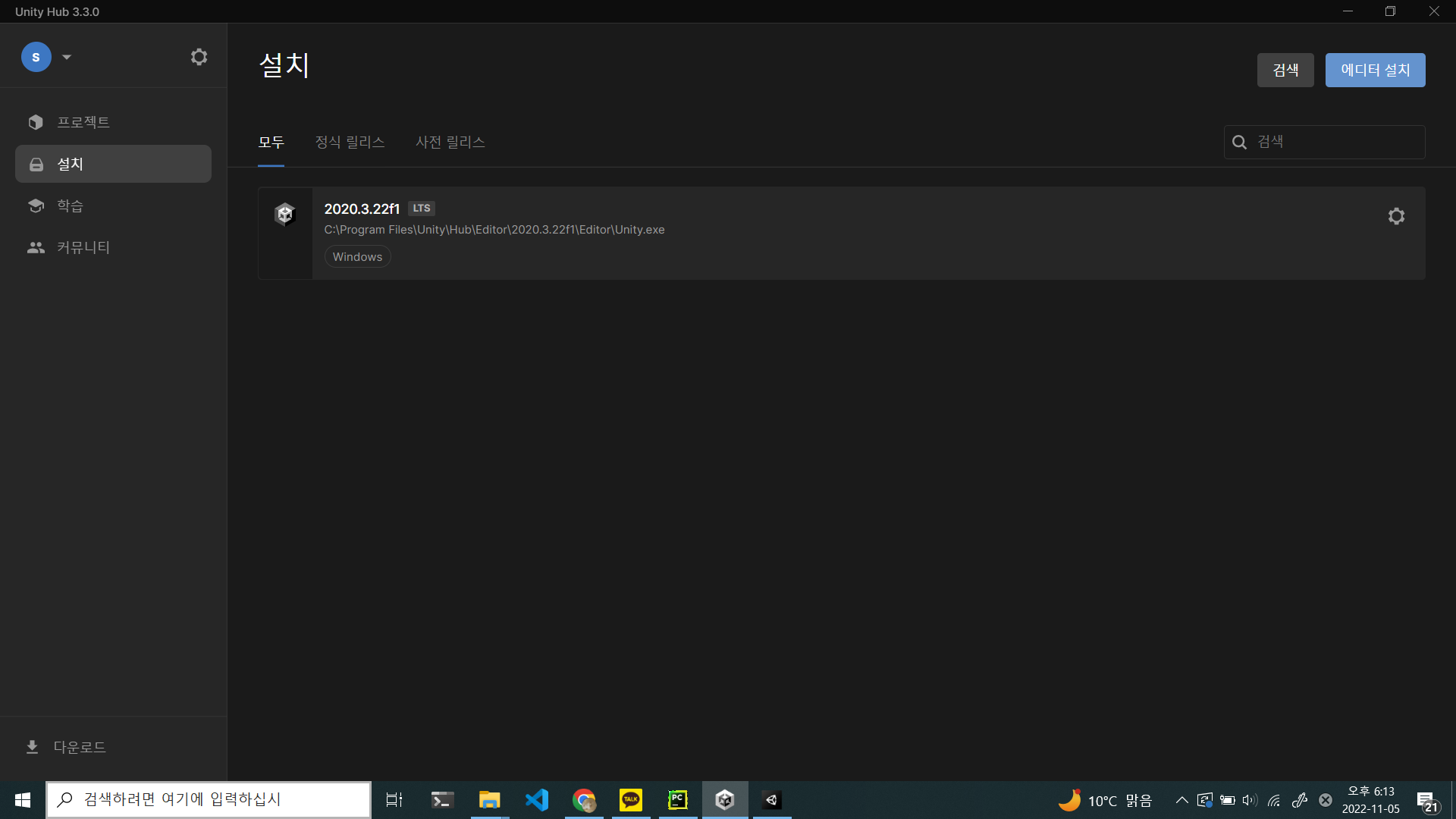 Unity [Unity] 유니티 필요한 에디터 버전 문제 해결 서이서 2022. 11. 5. 18:17 [Unity] 유니티 필요한 에디터 버전 문제 해결 유니티 크리에이터 키트 설치하려고 하는데 버전 문제로 안된다;-; 유니티 허브에서 설치 오른쪽 위의 에디터 설치 누른다 거기서 나오는 여러 버전중에 원하는 버전을 선택해서 다운로드 받으면 된다. 공유하기 게시글 관리 Too scarce, still filling it up 'Unity' 카테고리의 다른 글 상속과 컴포넌트 (1) 2024.09.28 'Unity' Related Articles 상속과 컴포넌트