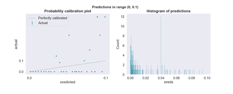 - 0~0.1 범위로 축소한 그래프를 봐도 확률들이 잘 조정되어 있지 않음