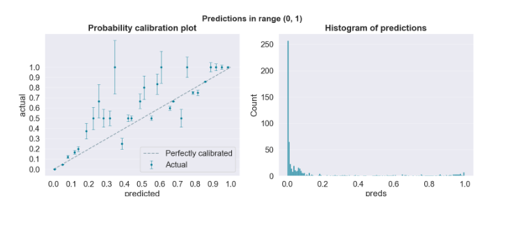 - 왼쪽 그래프의 x(predicted)를 확인해보면 0.2~0.8 사이의 값에서 분류기의 예측 확률이 잘 조정되어 있지 않음.