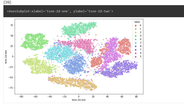 T-SNE는 기존 차원의 공간에서 가까운 점들은, 차원축소된 공간에서도 여전히 가깝게 유지되는 것을 목표로 하고 있다. 이로 인해 MNIST의 숫자 데이터셋이 같은 숫자 이미지끼리 유사한 거리에 놓이는 것을 확인할 수 있다.
