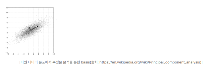 - 즉 데이터에서 분산이 가장 길게 나오는 기저(basis) 방향을 찾아서 그 방향의 기저만 남기고, 덜 중요한 기저 방향을 삭제하는 방식으로 진행된다.