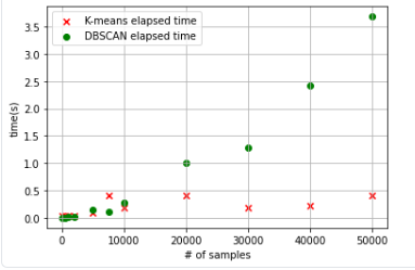 그러나 군집화할 데이터 수가 많을수록 수행 시간이 급격히 증가한다는 단점, 데이터 분포에 맞는 epsilon과 minPts를 지정해야 한다는 단점이 있다.