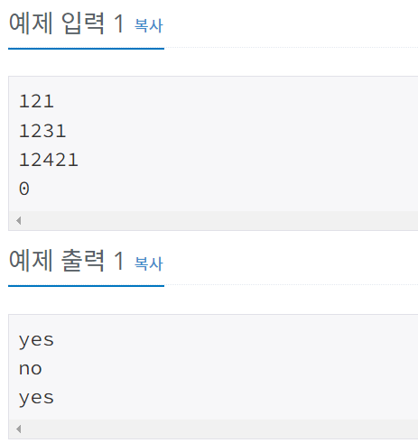 1259번: 팰린드롬수 입력은 여러 개의 테스트 케이스로 이루어져 있으며, 각 줄마다 1 이상 99999 이하의 정수가 주어진다. 입력의 마지막 줄에는 0이 주어지며, 이 줄은 문제에 포함되지 않는다. www