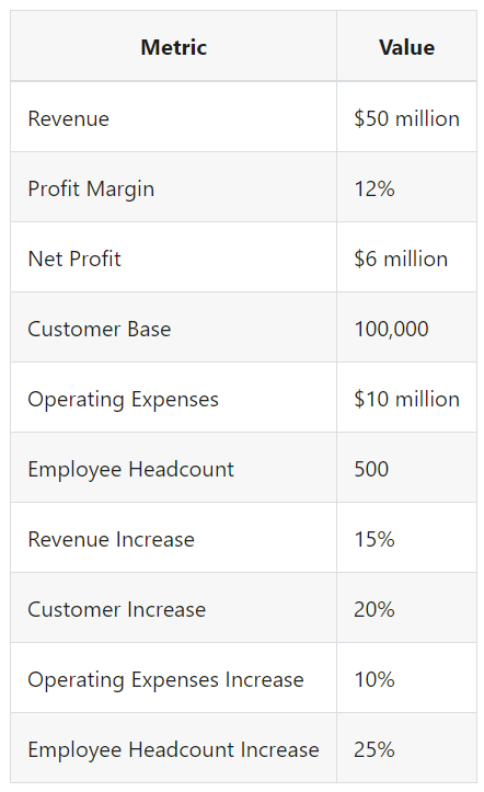 Additionally, the company's operating expenses went up by 10%, amounting to $10 million, while the employee headcount increased by 25%, resulting in a current workforce of 500 employees.