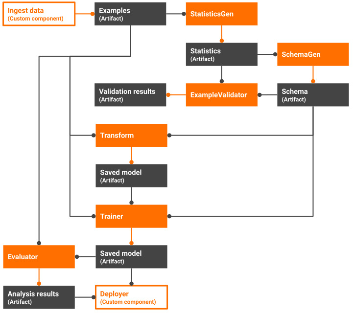 이렇게 TFX는 각 파이프라인 단계마다 각기 다른 컴포넌트들을 제공한다. 그러나 이러한 각 컴포넌트는 항상 순차적으로 동작하지 않기 때문에 각 단계를 연결하는 glue code를 작성하는 것은 쉽지 않다. 따라서 TFX에서는 Apache Beam, Apache Airflow, Kuberflow 등의 파이프라인 오케스트레이션을 통해 파이프라인의 각 과정을 관리하고 표준화된 도구를 통해 glue code로 인해 발생할 수 있는 버그를 예방한다.