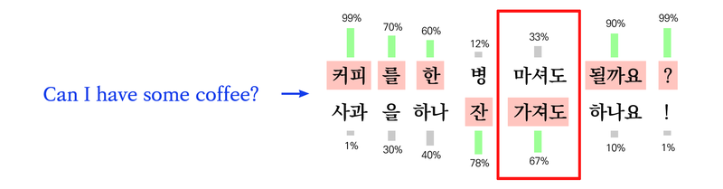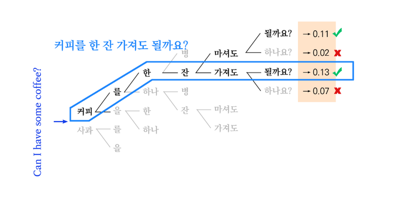 이러한 문제를 어떻게 해결할 수 있을까? 단어사전으로 만들 수 있는 모든 문장을 만든 후 사용자가 직접 고르는 방법은 어떨까? 수많은 문장들이 생성될 수 있겠지만 최적의 번역을 선택할 수는 있을 것이다. 이러한 아이디어에서 시작된 방식이 Beam Search 방식이다.
