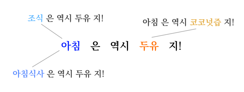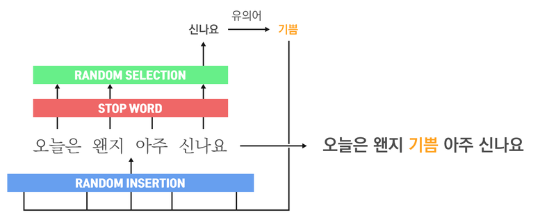 - 주어진 문장에서 불용어(Stop word)가 아닌 단어를 랜덤하게 뽑은 후, 해당 단어와 유사한 단어를 골라 문장에 아무렇게나 삽입하는 방식