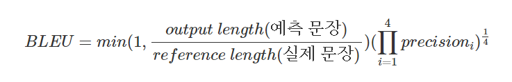 다음과 같은 공식을 통해 BLEU를 측정할 수 있다.