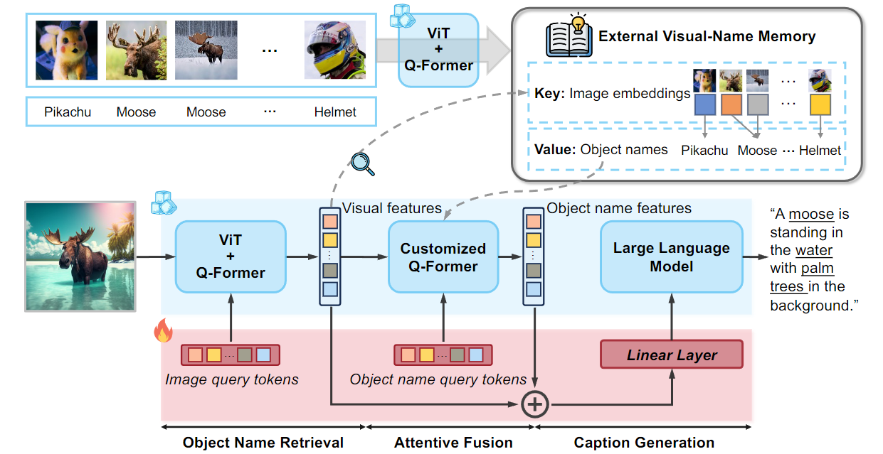 EVCAP에서는 External Visual Name Memory를 이용해 이미지 임베딩과 object name을 retrieval하고 이를 Attention Fusion을 이용해서 필터링한 결과를 LLM에 입력하여 더 나은 Caption을 생성함.