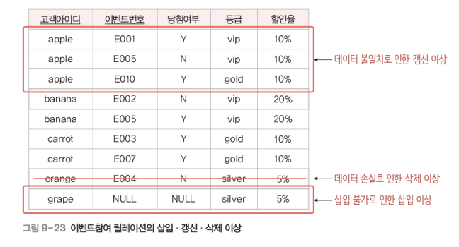 - 불필요한 데이터 중복으로 릴레이션에 대한 삽입, 수정,삭제 연산 수행시 발생할 수 있는 부작용