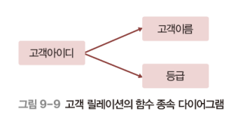고객아이디 속성 값에 대응되는 고객이름 속성과 등급 속성 값이 단 하나인 조건을 만족하여 고객이름과 등급(y)은 고객아이디(x)에 함수적으로 종속됨