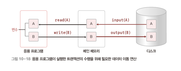 트랜잭션이 db 데이터를 처리하기 위해서는 데이터를 디스크에서 메인메모리로 가져와 처리한 후 그 결과를 디스크로 보내는 작업 필요. 메인 메모리 버퍼 블록의 데이터를 응용 프로그램의 변수로 가져오고 데이터 처리 결과를 저장한 변수 값을 메인 메모리 버퍼 블록으로 옮기는 작업 필요