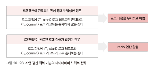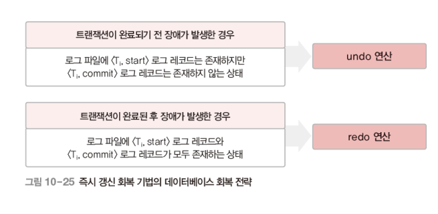 - 장애 발생 시점에 따라 redo나 undo 연산 실행해 데이터베이스 복구