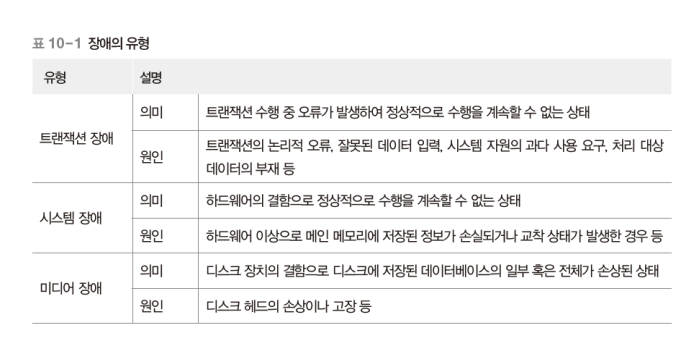 - 지속성의 보장을 위해 트랜잭션 완료 후 발생하는 장애에 대한 회복기능 필요