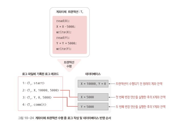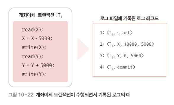 - 로그(log): db에서 변경 연산 실행될 때마다 데이터 변경 전후값을 별도 파일에 기록